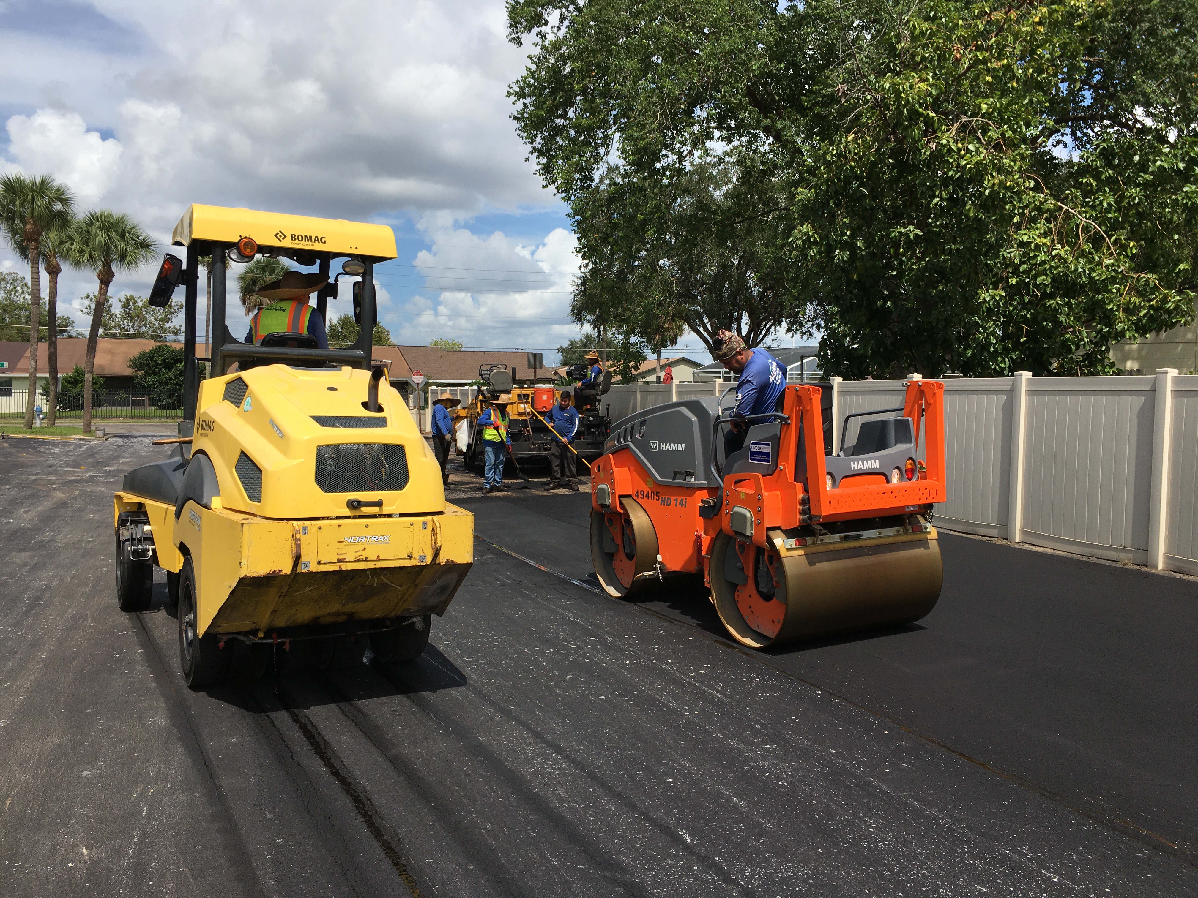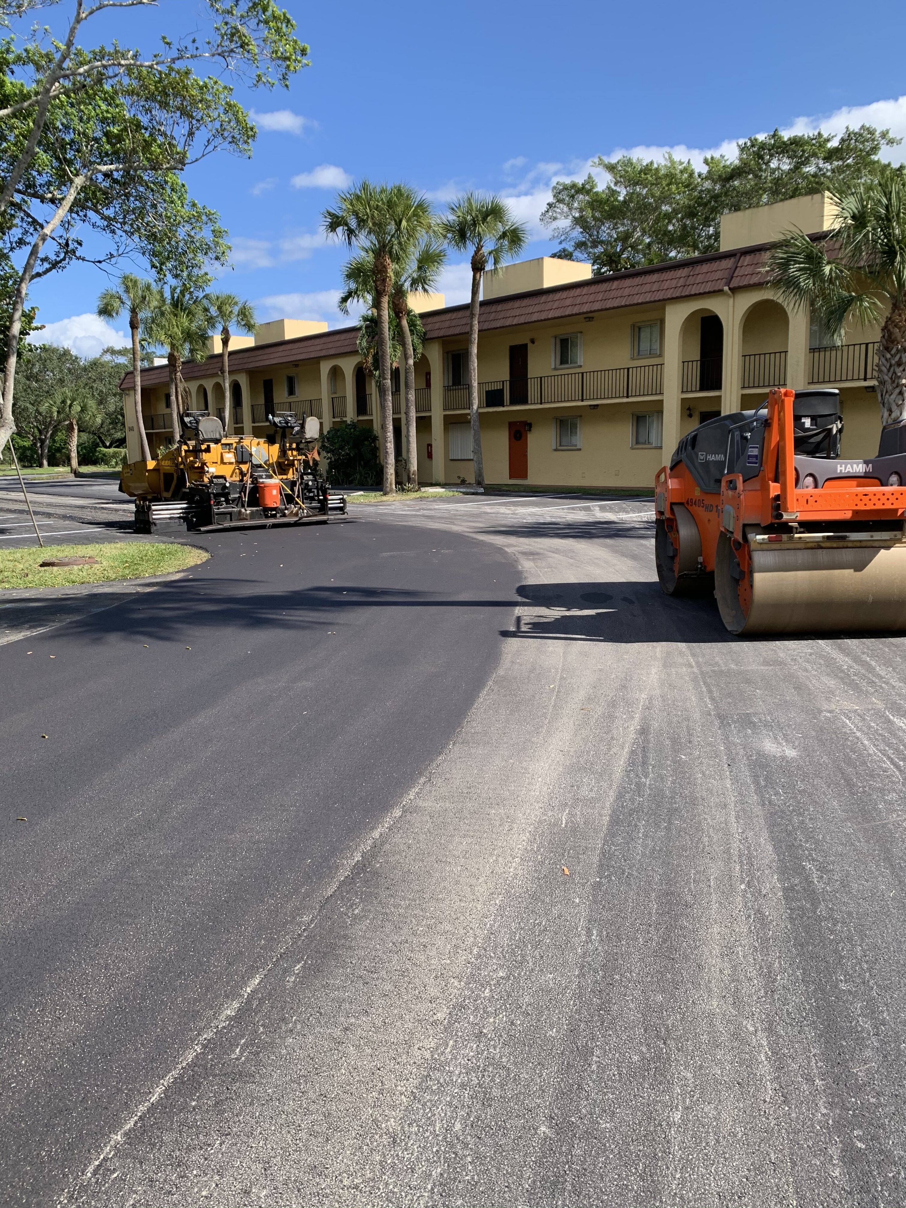 Once the foundation is solidified and is properly compacted, DOT approved limerock is installed. This limerock functions as the new base foundation that is graded to form the proper base for the new asphalt. Once the limerock is prepped for paving, a layer of DOT approved tack coat is applied to the surface which ensures asphalt adhesion and a level surface. After that, a hot asphalt mix is loaded into the asphalt paving machine and laid down by the asphalt paving crew. This creates an even layer that is slightly thicker than the desired depth, so that the pavement has increased strength and is smooth to drive on. The asphalt paving process is completed when the top layer is compacted with a vibratory roller to the proper thickness, and flattened with a rubber tire roller that creates a smooth and even surface.